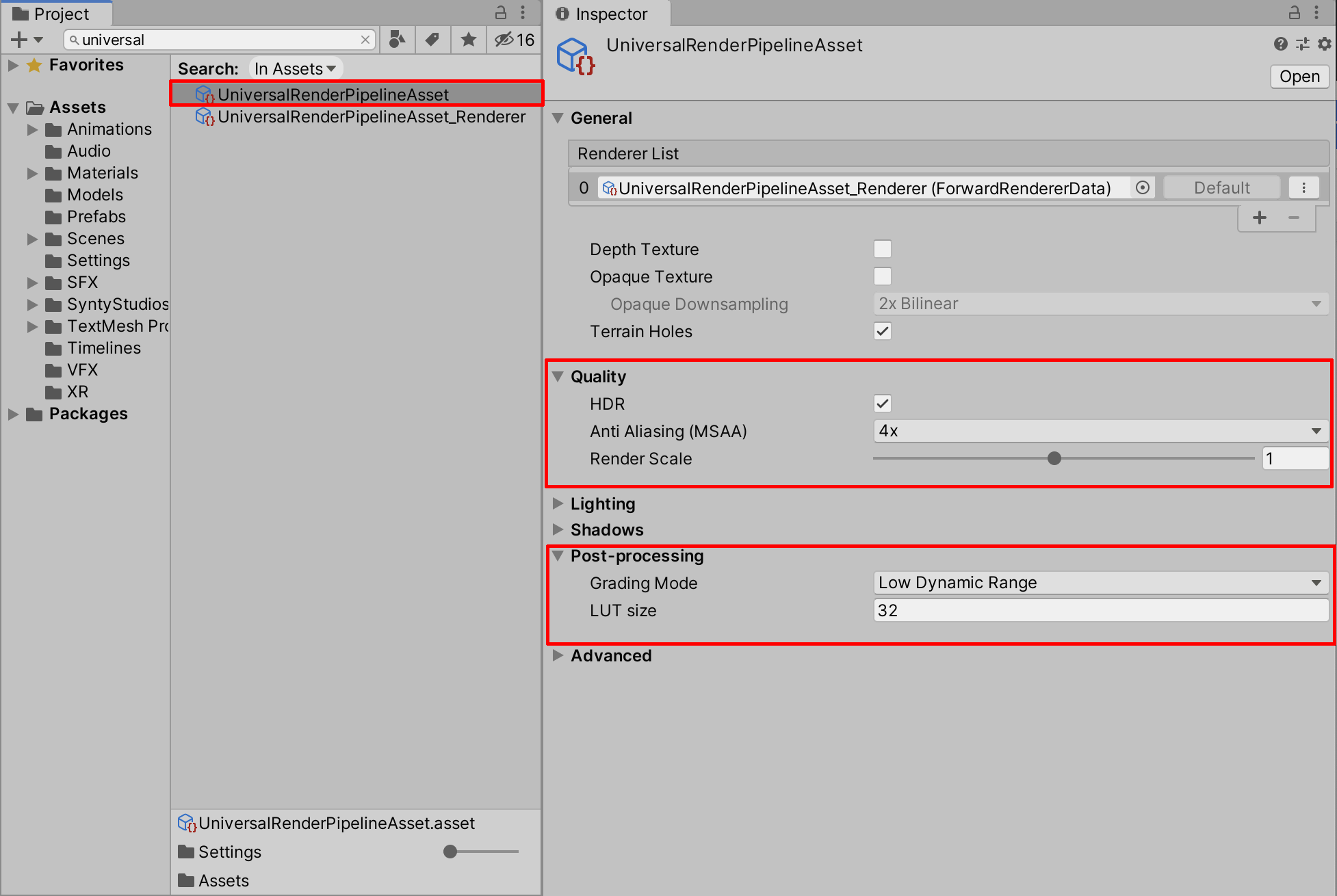 1. Locate the UniversalRenderPipelineAsset by typing it into the search field in the Project window.