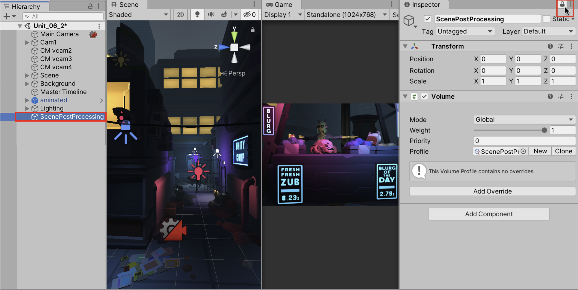 1. With the ScenePostProcessing GameObject selected in the Hierarchy window, select the Lock button in the upper-right corner of the Inspector to keep the GameObject’s properties visible (Figure 05).
