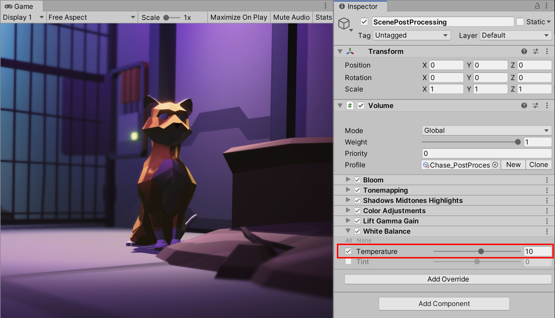 Next, you’ll apply the Color Adjustment Volume Override. With this override, you can modify and adjust the overall exposure, contrast, hue, and saturation of the Scene.