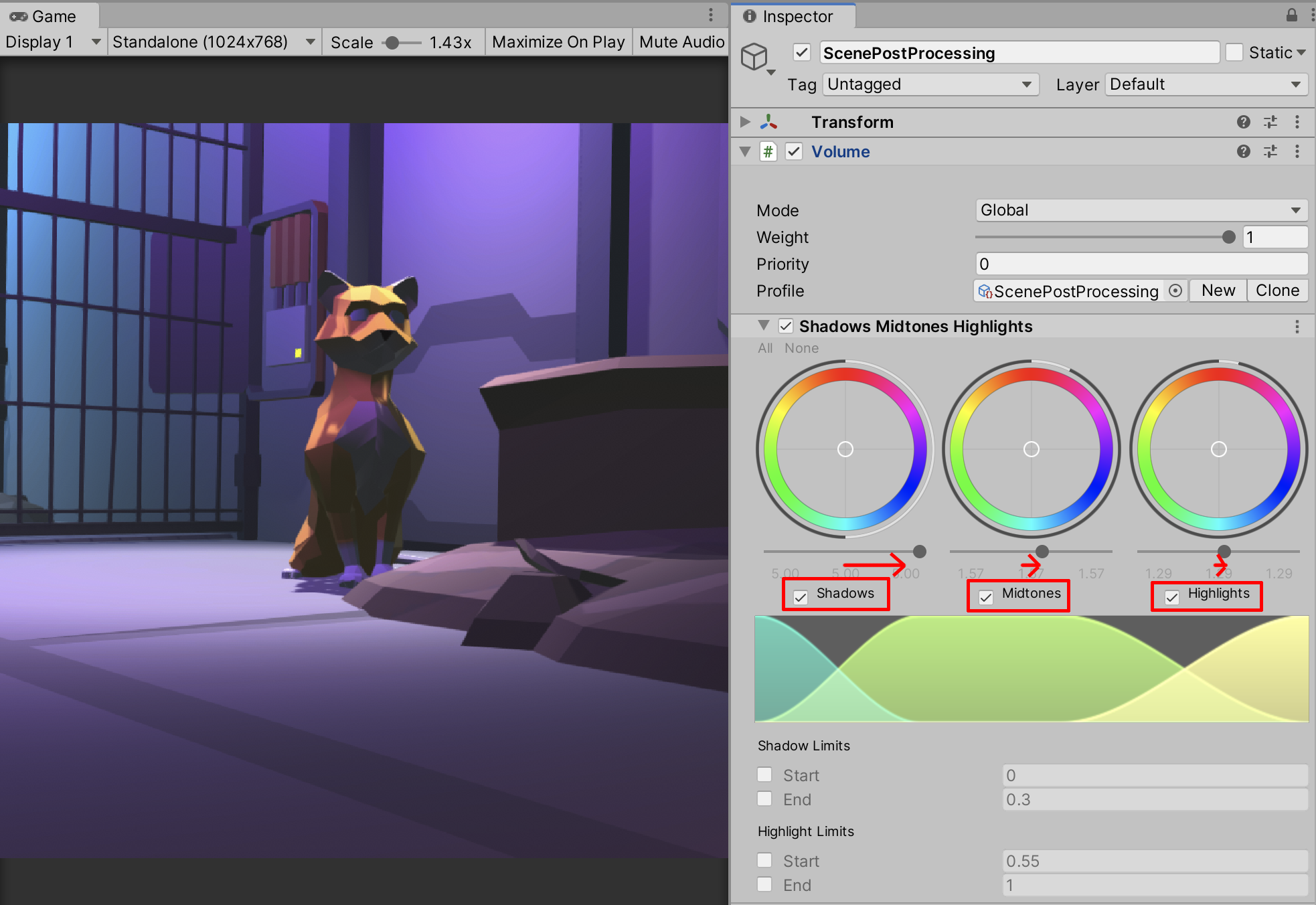 You’ll begin with the Shadows Midtones Highlights post-processing effect that separately controls the values for shadows, midtones, and highlights. This effect is used to precisely define the tonal ranges for each value range.