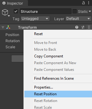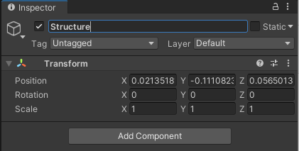 2. Rename this GameObject to “Structure” in the Inspector. Its name will also change in the Hierarchy. (You can rename objects from the Hierarchy as well)