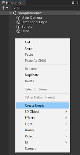 1. Right-click in the Hierarchy and select Create Empty.