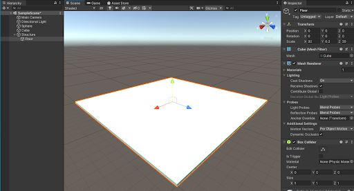 3. In the Inspector, locate the Transform component and the Scale coordinates for the Floor GameObject. Change the Scale to 20, 0.2, 20 to create a floor for your structure.