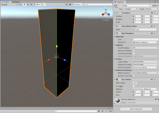 4. With the Cube selected, change the Y value of the Scale in the Transform Component to 4. The Cube height will change to 4. Zoom out as needed.