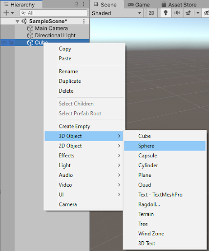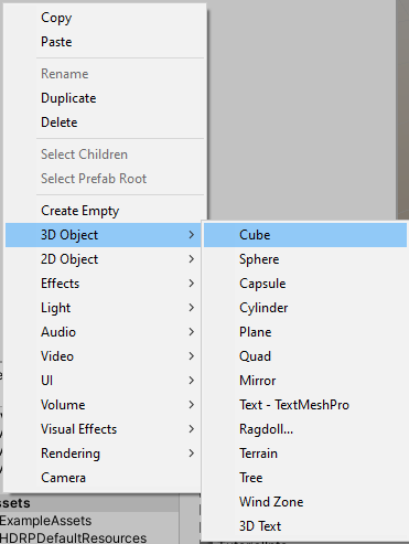 1. To create a cube primitive in the Scene, right-click an empty section in the Hierarchy and select 3D Object > Cube.