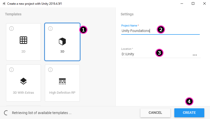Select the 3D template option (1), give your project a name (2), select the location you wish to save the project (3), and select Create (4). Your new project will contain one Scene.