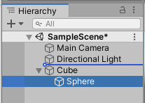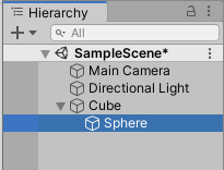 As shown in the Hierarchy, the Sphere is a child GameObject of the Cube. These two objects are now linked. You can operate on them as a unit.
