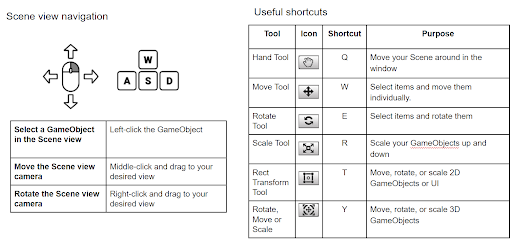 Review the shortcuts for navigating the Scene view and refer to the cheat sheet below for a summary of the commonly used shortcuts for both navigating your view and manipulating GameObjects.