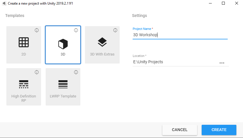 2D: Creates a project for 2D development. All cameras will automatically be set to orthographic, and the Scene view will be set to 2D.