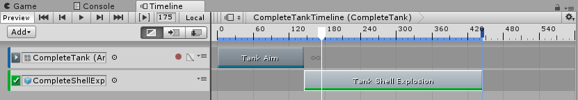 Just like any other tracks within the Timeline Editor, you can position and move the Activation Track Clip to begin playing where you position it. In the example below, there are two separate animations (a tank and a shell explosion) that are bound together for a cutscene. (Figure 05)