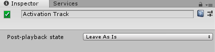- Leave As Is: Select to set the activation state of the bound GameObject to the same state at the end of the Timeline Asset. For example, if the Timeline Asset ends with the GameObject set to inactive, the GameObject will remain inactive.