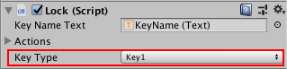 5. Inspector で、その Lock コンポーネントを見つけます。ドロップダウンメニューを使用して、Key Type の値を選択したキー名に設定します。