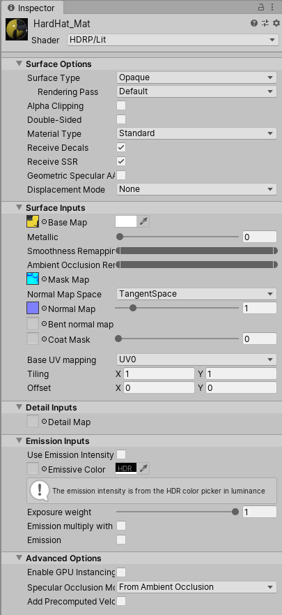 Properties that make up an HDRP Material are broken down into several categories: Surface Options, Surface Inputs, Detail Inputs, Emission Inputs, and Advanced Options (Figure 02).