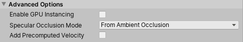 - Specular Occlusion Mode: This determines the mode used to calculate Specular Occlusion. Options are from the Ambient Occlusion map and the Camera’s view vector, or from the Bent Normals map.