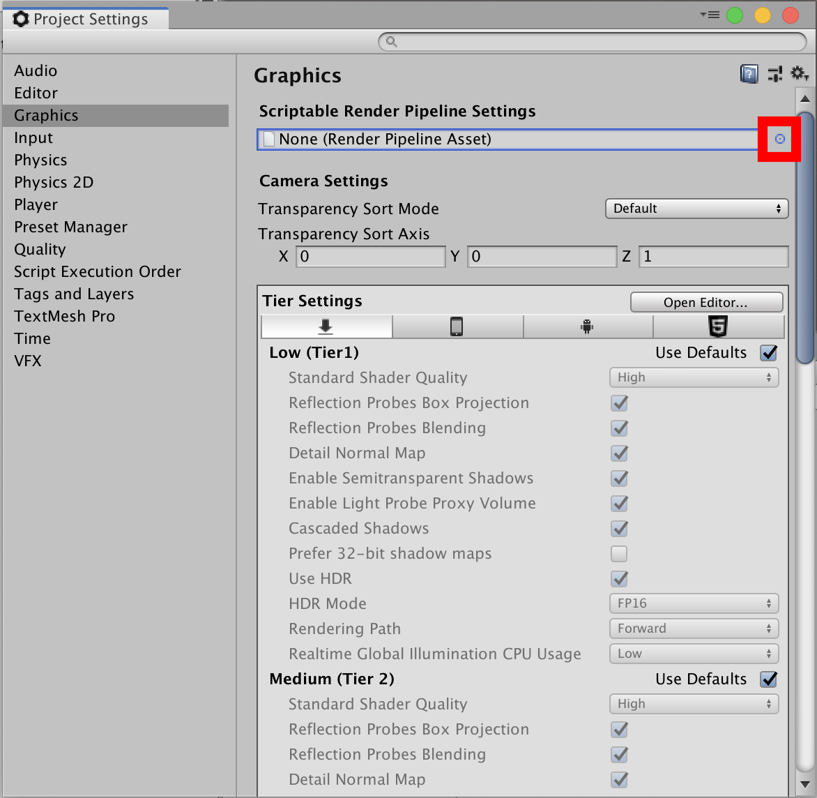 3. In the Graphics Inspector, click the circle highlighted in red in Figure 03 and select HDRenderPipelineAsset (Figure 03).