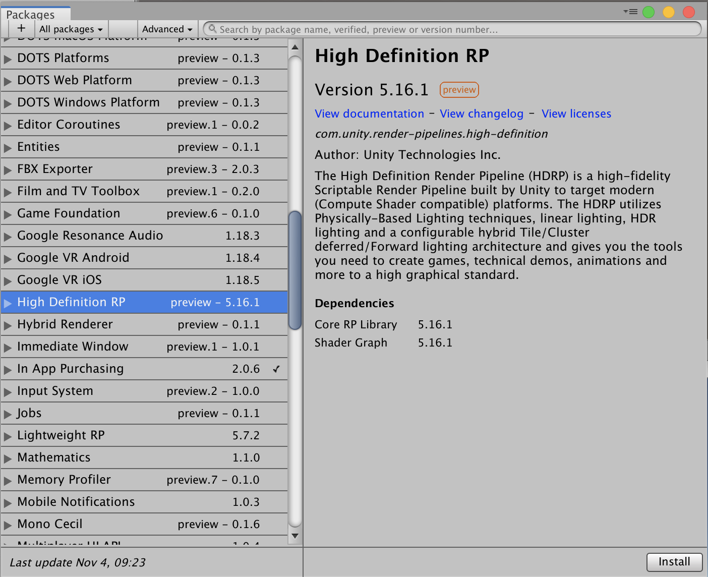 To upgrade an existing project, you must first download HDRP using Unity’s Package Manager.