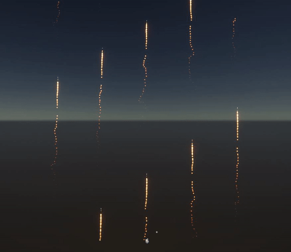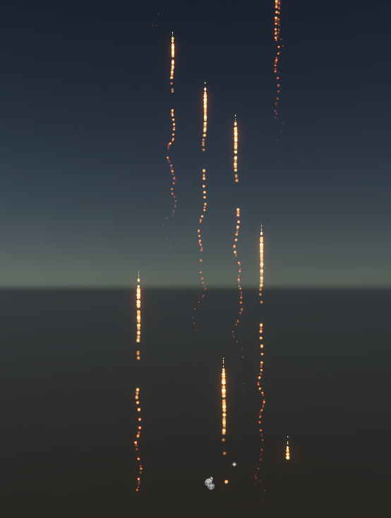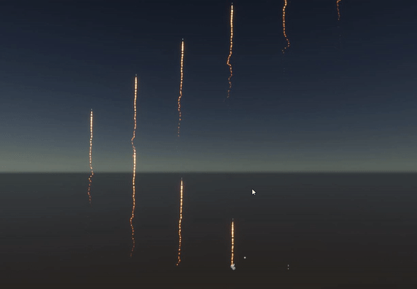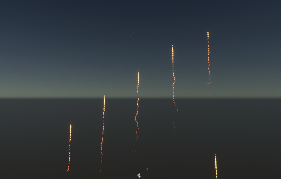 This image shows fireworks created in Visual Effect Graph as particles that are spawned from different positions with a sequential line position block: