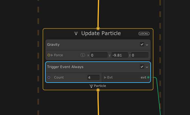 In the fireworks example, the effect is already using a Trigger Event Always block to trigger another system, which is spawning the trail on the fireworks. This block’s count is set to 4, so every time an update happens, the first system triggers the GPU Event system to spawn four particles.