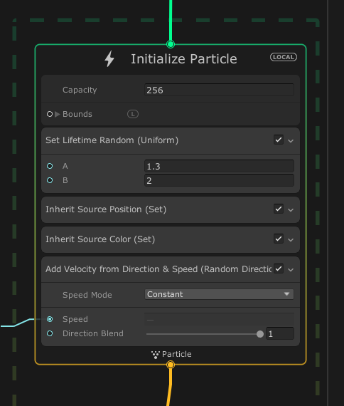 Visual Effect Graph’s event system communicates the starting and stopping of systems within an effect. As an extension of this, GPU Events in one system allow you to spawn particles from another system using triggers that are called inside an Update Context. GPU Events are blocks that communicate between two systems.