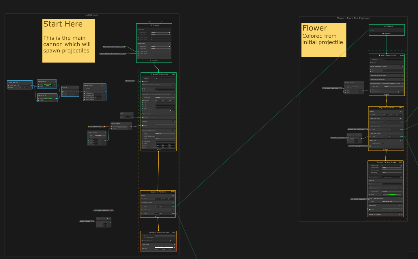 - In the main firework Update Context, the systems being triggered by an Event has blocks labelled with Inherit in their Initialize contexts (Figure 6). This is the data that each system receives, or inherits, from the first firework. For example, the flower explosion is inheriting Position and Color from the first firework system. This means that the Graph will spawn the flower particles where the original firework particle dies and apply the same color. You can pass other types of data using Inherit blocks.