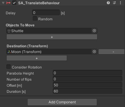 We then need to set an offset value which means to set a distance from the center of the destination point to the actual position at which the object will stop, otherwise it will collide with it. Set 50 meters. Then set 60 seconds for the duration to reach the destination or another value depending on the speed you want the shuttle to have.