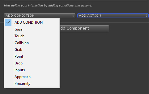 We are now going to see how to use conditions. Conditions are events happening in the scene, either because of the user’s actions or because of the interaction between objects. Zoe has several conditions already set, available through the 'ADD CONDITION' list inside every interaction. You can detect when an object has collided with another, when it is close to another, when the user has looked at an object, has touched it, grabbed it etc.