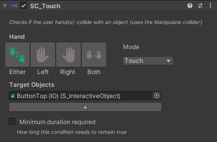 Duplicate the Empty interaction and create a new one called ‘LaunchSpaceShuttle’. Add the Touch Condition from the 'ADD CONDITION' drop down list. Choose ‘Either’ hands and leave the mode to ‘Touch’. Under Target Objects you can see the ButtonTop(IO) already set: