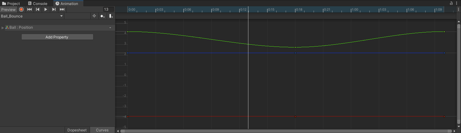 In cases like the bounce animation, an animator must modify the tweens themselves, and in Unity this is done through the Curves editor. Until this point you have been working in a section of the Animation editor called the Dopesheet, which is where all keyframes are set.