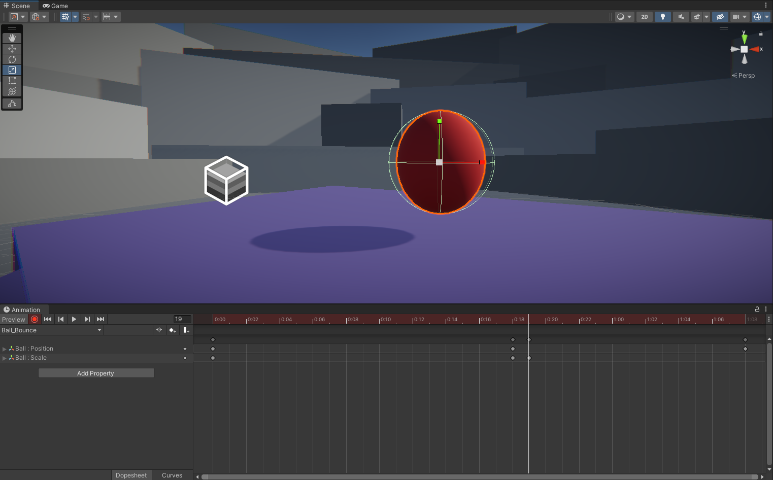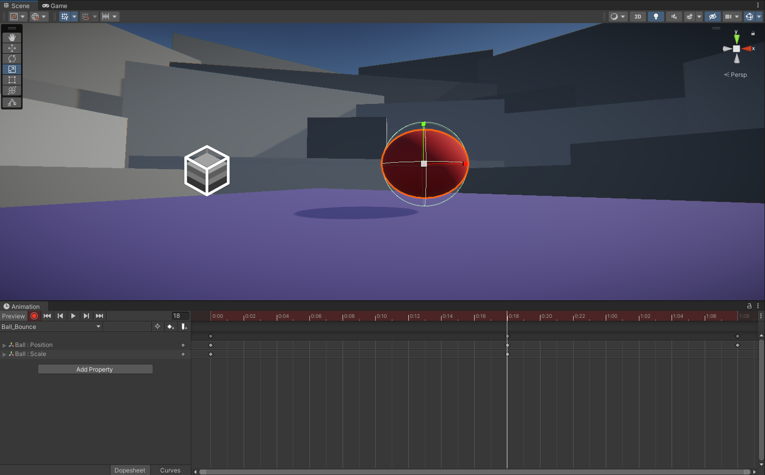 1. Continuing in the TutorialScene_Animation_Outdoor, select the Ball and ensure the Animation editor is still open. If it isn’t, refer back to the previous tutorial on how to open it.