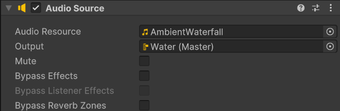 4. To assign the waterfall sound to the Water mixer group, select the waterfall audio GameObject, locate the Output property in the Audio Source component, and use the Output picker (⊙) to select the Water group.