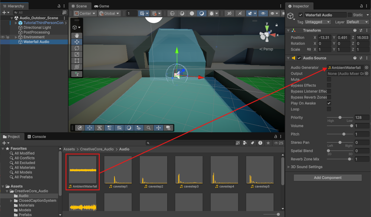 3. Locate the AmbientWaterfall audio clip in the Assets > CreativeCore_Audio > Audio folder and add it to the Audio Generator variable of the Waterfall Audio Source.