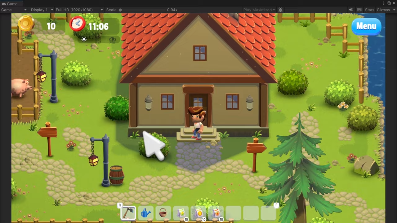 Look at all of the text elements you can see in the single screenshot below from Unity’s Happy Harvest demo game. Text is efficiently used to convey coin count, time remaining, inventory numbers, keyboard shortcuts, and a menu.