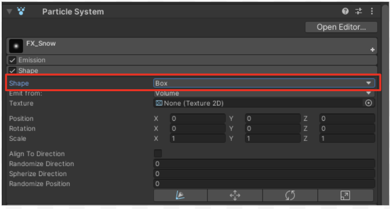1. Select the Shape module to expand it and notice the cone-like shape that appears in Scene view, then change the Shape property from Cone to Box.