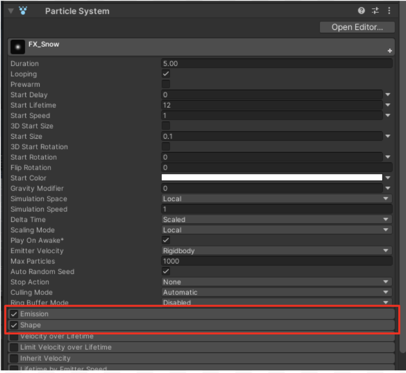 - The name of the main module takes the name of the GameObject it’s on (e.g. FX_Snow).