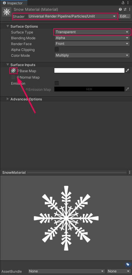 - The Base Map texture is set to the Snowflake or Raindrop texture, which have transparent backgrounds. If you wanted to create your own particle texture in a program like Photoshop or Illustrator, you could use that as the Base Map instead.