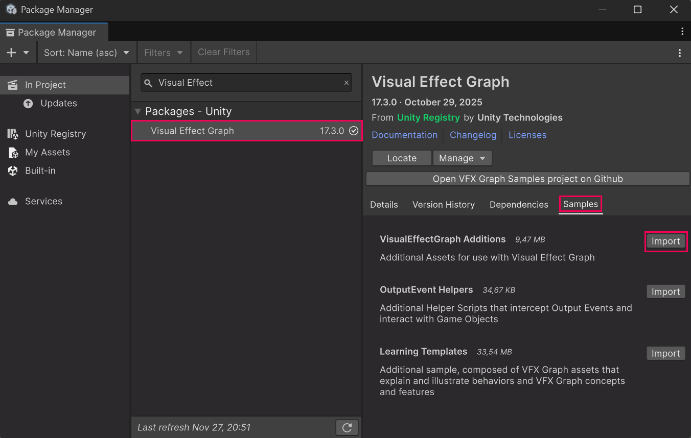 1. From the main menu, select Window > Package Management > Package Manager, choose In Project from the left panel and search for Visual Effect Graph, then select it. From the right panel, expand the Samples fold-out, then select Import to add the VisualEffectGraph Additions.