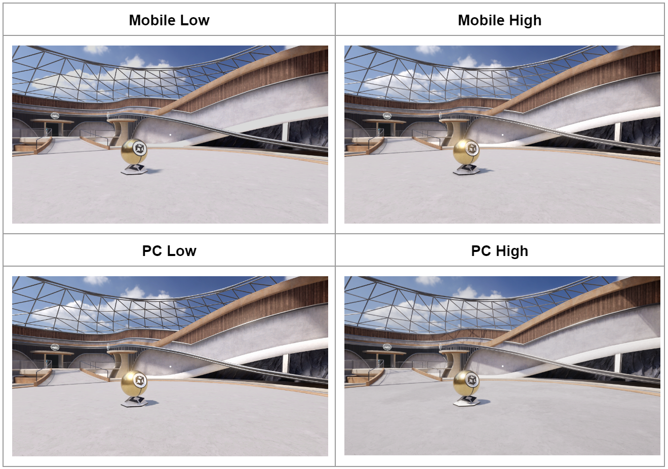 3. Click the Mobile Low, Mobile High, PC Low, and PC High text and notice the changes in the Scene view, focusing on the shadows, lights, and reflections on the half-painted blue wall.