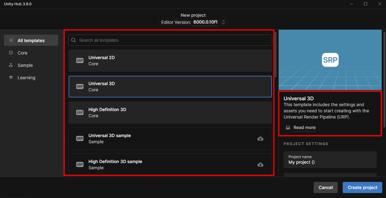 1. Open the Unity Hub and select New Project. You will notice a long list of possible templates to choose from. As you click through the options, you can also see a brief description of each template on the right side, with an option to Read more.