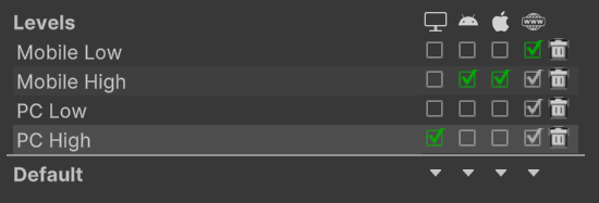 2. From the main menu, select Edit > Project Settings > Quality. At the center of the panel, you will see Low, Medium, and High Quality Levels and a green checkbox indicating the default quality level for each target platform.