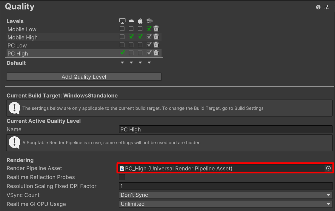 4. In the Quality Settings window, double-click the Render Pipeline Asset which, in the example in the screenshot above, is named PC_High (Universal Render Pipeline Asset). Your Render Pipeline Asset may be named differently, if you have a different quality level selected.