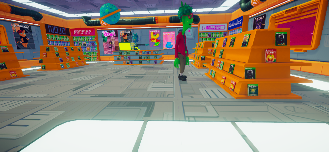 A fun, colorful, cartoony video game shop interior set in outer space staffed by green, four-armed aliens.