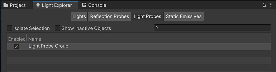2. Select the Light Probes tab. You can use this to check the status of Light Probes in a scene.