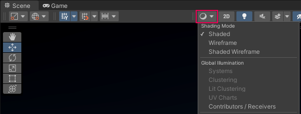 3. In the Scene view control bar, use the Draw Mode dropdown (top middle) to select Contributors / Receivers (in the Global Illumination section).