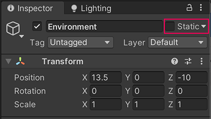 1. In the Hierarchy, select the Environment GameObject. In the Inspector, enable its Static property.