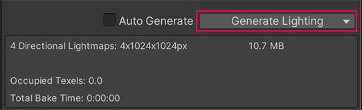 4. Back in the Lighting window, select Generate Lighting at the bottom of the window to bake a lightmap. You’ll see the baking progress on the right side of the Unity Editor window footer.