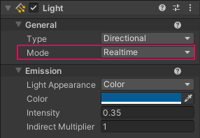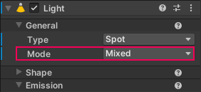 2. In the Inspector, find the Mode property in the Light component.