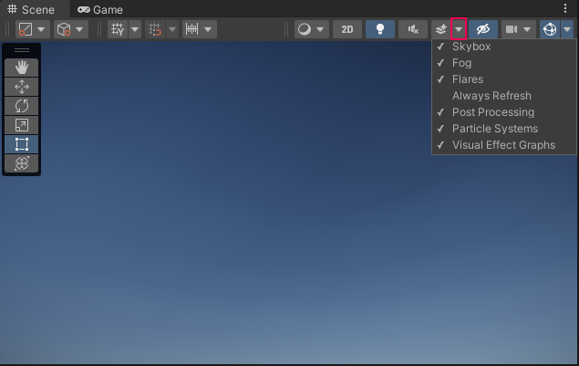 If you only see grey in the Scene view, use the Effects dropdown in the Scene view control bar to enable the skybox.