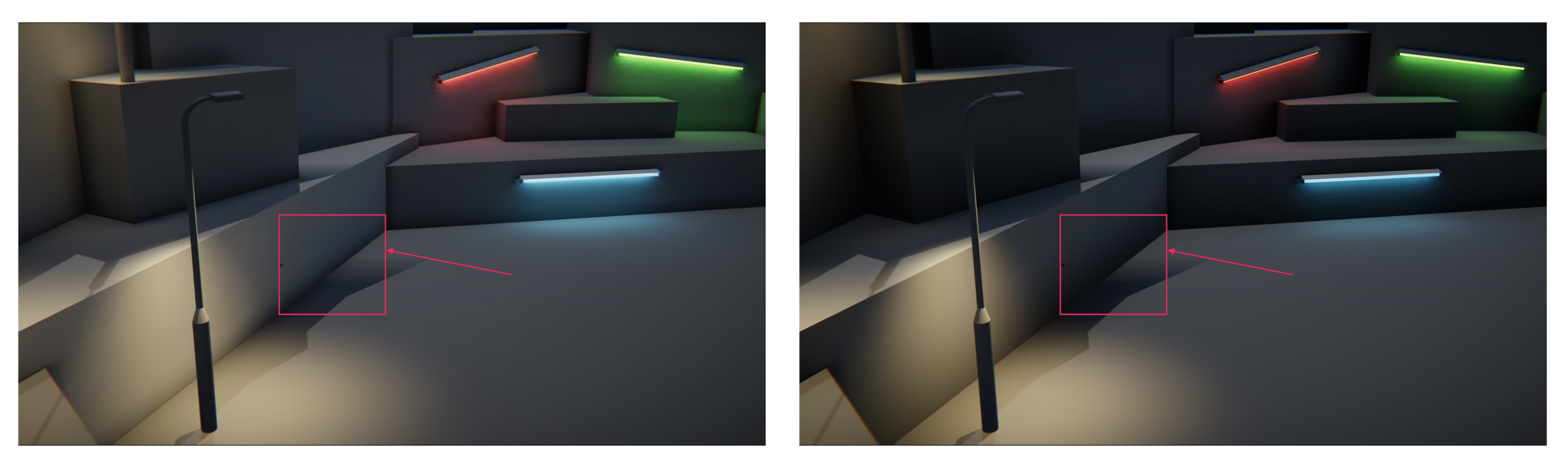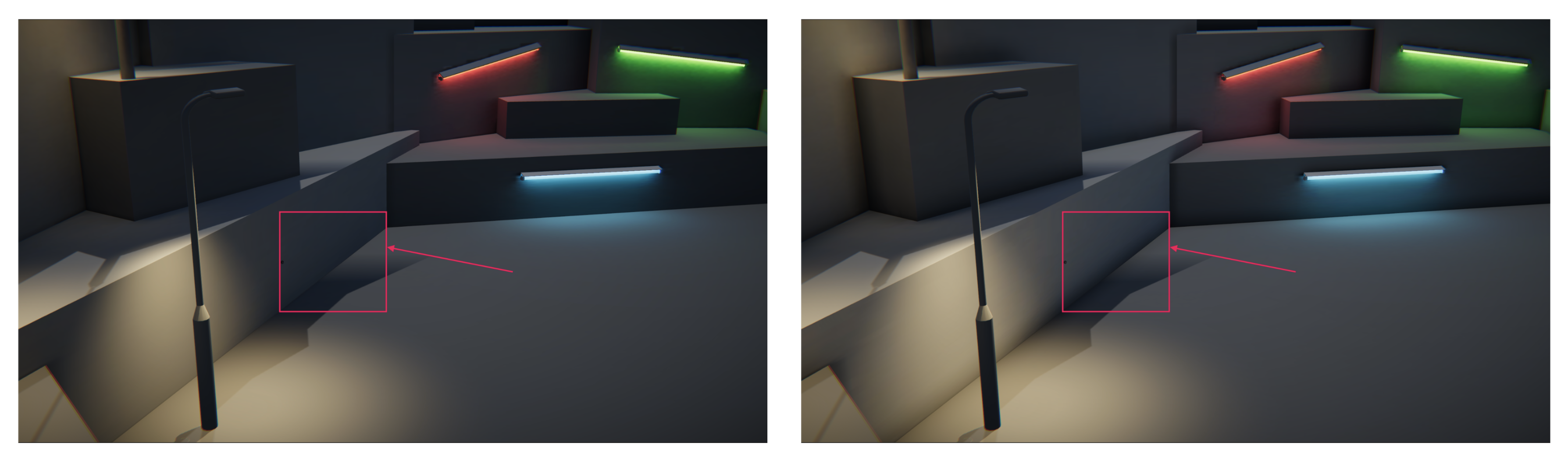The below image on the left has a low lightmap resolution (5), while the image on the right has a high lightmap resolution (60).