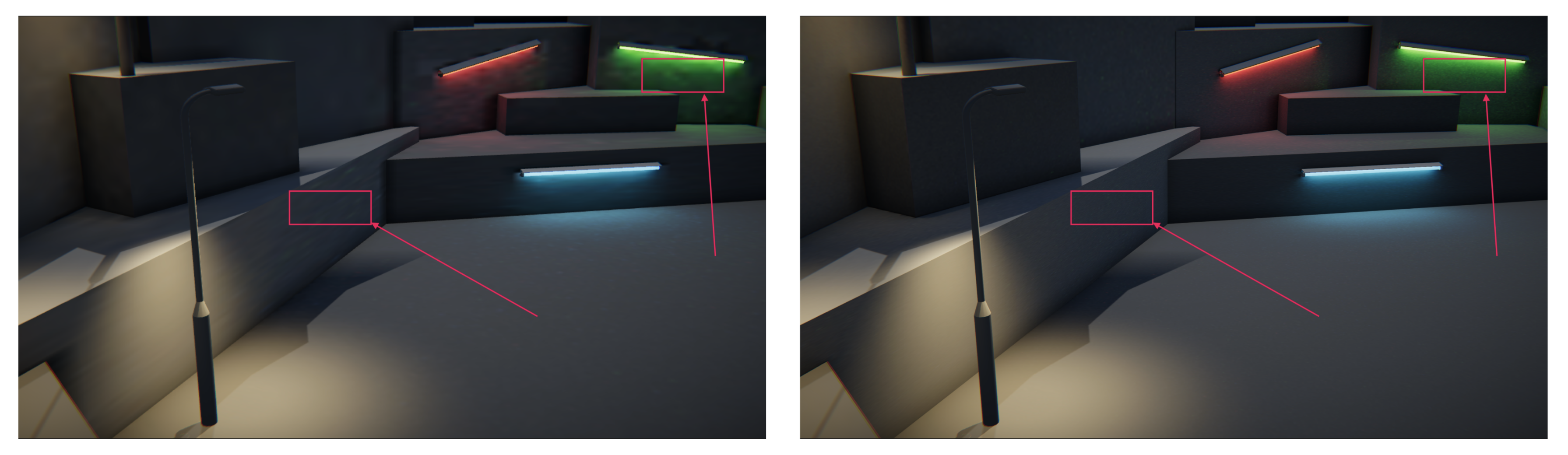 - Ambient Occlusion: This simulates the subtle shadowing effect caused by nearby objects blocking indirect light, enhancing the realism of the scene. It’s most often seen as darkened areas in corners where walls meet. The below image on the left has ambient occlusion disabled, while the image on the right has it enabled.