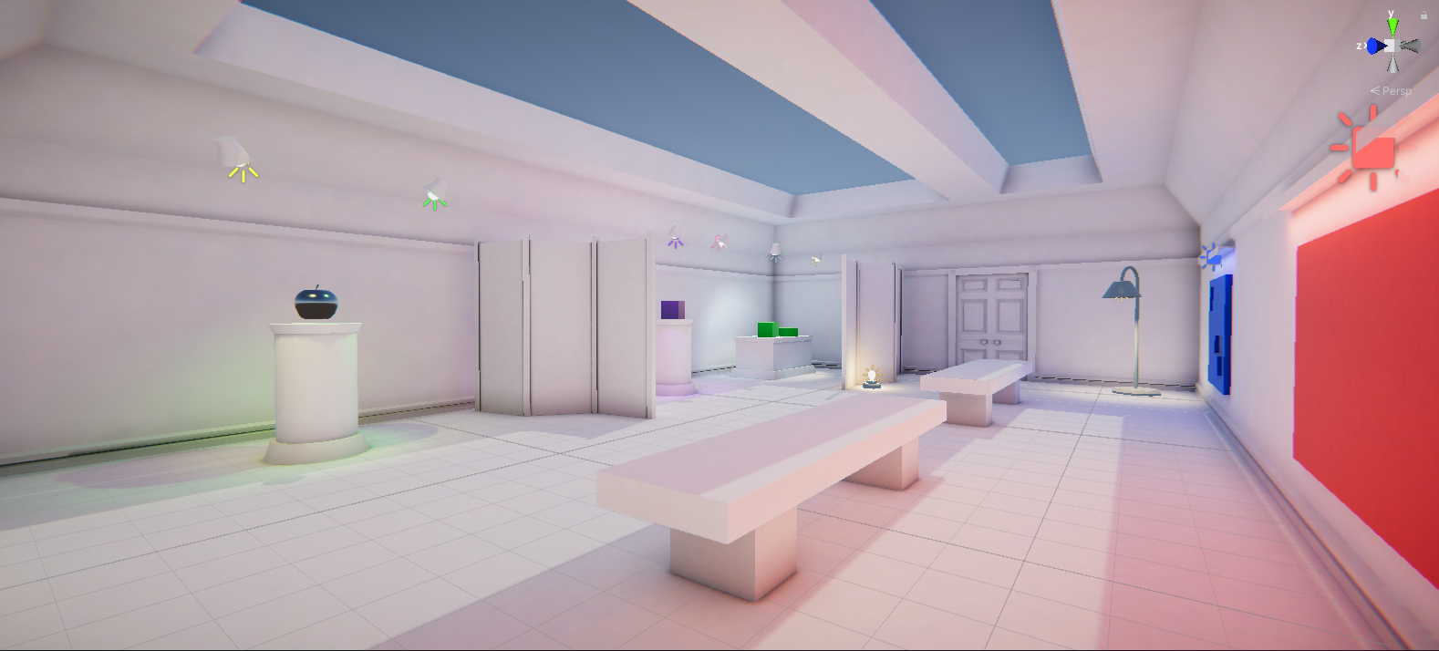 The emissive light beam helps a little, but overall the gallery is still a little dark. You don’t necessarily need to add additional light sources to address this — in fact, given the relatively naturalistic approach in the scene, that wouldn’t be ideal.